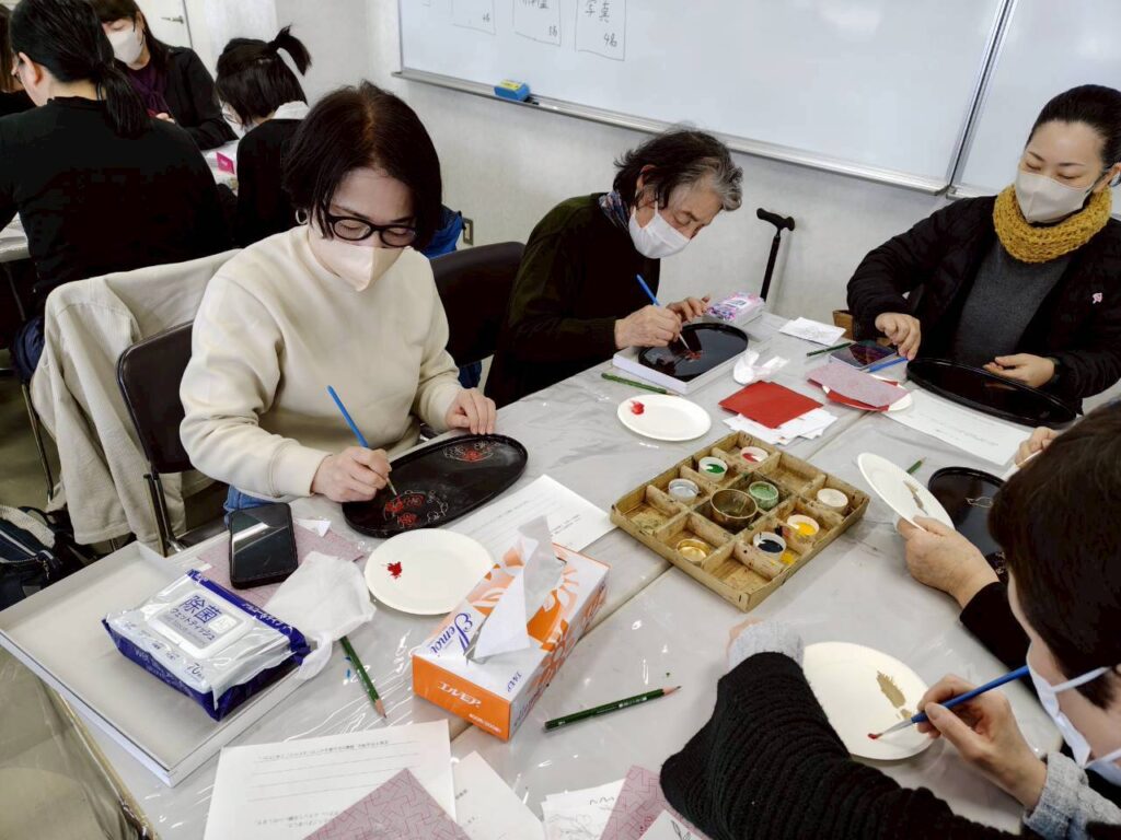 34名の参加。親子・家族での参加もあり、和気あいあい明るい教室となりました。それぞれの素材に合わせて席を設けました。我々の席の近くまで来てくださり丁寧な指導をいただきました。素材に赤いカーボン紙を当て、その上に型紙をのせ鉛筆でなぞり、その後に絵筆で色漆(カシュー)を使って描きました。自由な発想・斬新なデザイン・古典的な優美な作風どれも素晴らしい美術工芸品となりました。